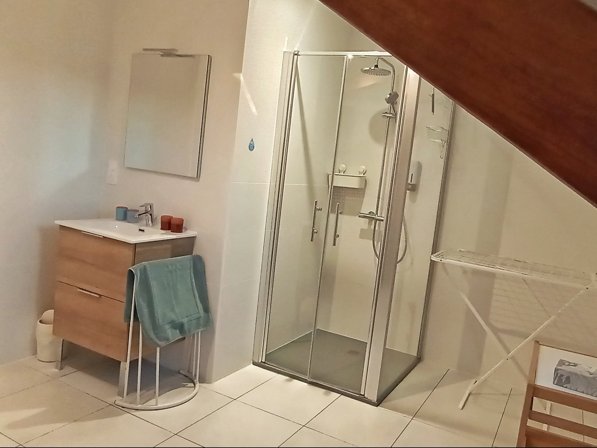 Salle d'eau : Une grande salle de bain avec douche spacieuse et machine à laver (idéal pour les longs séjours).